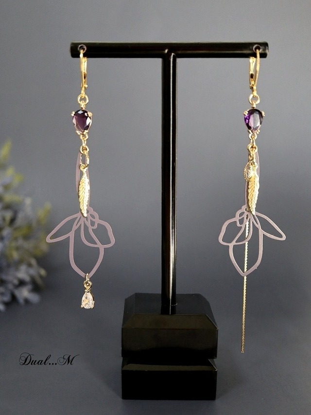 【黒蝶の気配を纏う、薄紫のエレガンス】 “ Améthyste Noire Papillon(アメジスト・ノワール・パピヨン)”は、 黒蝶とアメジストが交差するような、静かで強い世界観を表現した耳飾り。 薄紫の花が色香を漂わせ、 その下で揺れるアメジストカラーの雫が、耳元に上品な光を添えます。 蝶とブラックの薔薇モチーフが、全体を引き締めるように配置され、 大人の女性に似合う“ノワールの美しさ”を際立たせています。 強さと品格を併せ持つ、個性派エレガンス。 日常の装いはもちろん、特別な日のコーディネートにも映えるデザインです。 ⸻ 【サイズ】約 8cm 【重さ】軽量で長時間でも耳に負担が少ないつくりです。 【金具】 ・ピアス : サージカルステンレス (ポストピアス) ・イヤリング : 痛くならないイヤリング(ニッケルフリー) * お花の部分だけでも楽しめる2way仕様です✨ (ピアスのみ) * イヤリングは2wayではありません。 * 変色防止ペーパー 1枚 お付け致します。 ______________________ 1点ずつ丁寧に手作業で制作しておりますが、左右差や形にわずかな違いが生じる場合がございますのでご了承ください。 色や素材感はできるだけ実物に近いものを掲載しておりますが、光の具合やPC環境などにより違いが生じる場合がございます。 金属アレルギーには個人差がございます。すべての方がアレルギー反応が出ないことを保証するものではありませんのでご注意ください。 お届けした商品に破損や不備、商品の不足があった場合、商品到着後3日以内にご連絡ください。確認の上で、至急交換または返品の対応をさせていただきます。 Dual…M Accessory