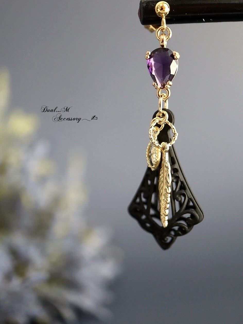 立体的なマットブラックのフレームは香水瓶を連想させるような魅力的なフォルム。揺れるゴールドの羽と小さなジルコニアチャームが視線を集めます。