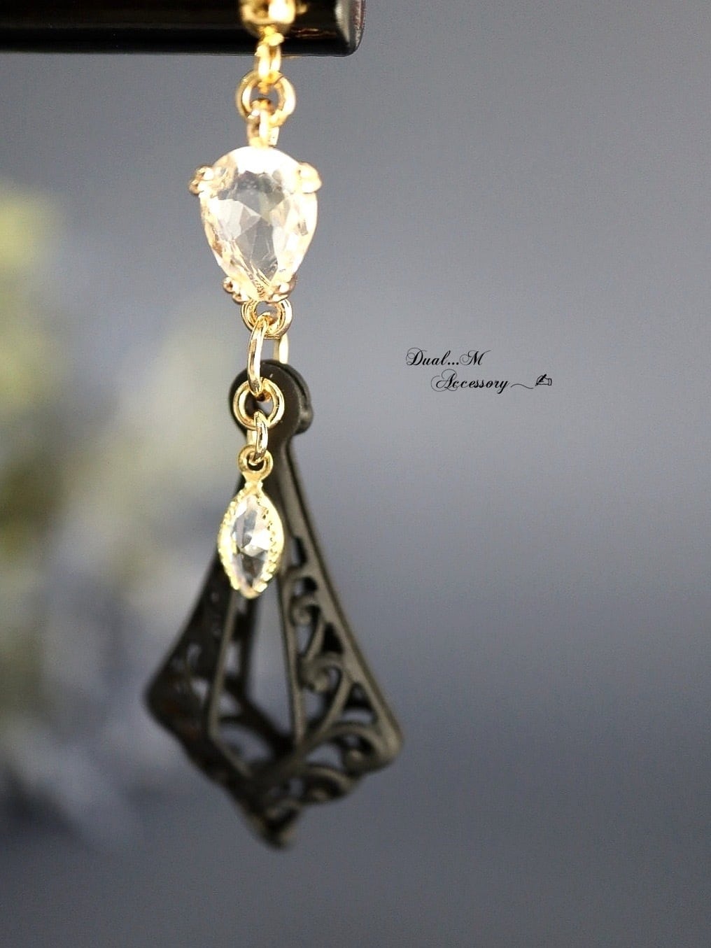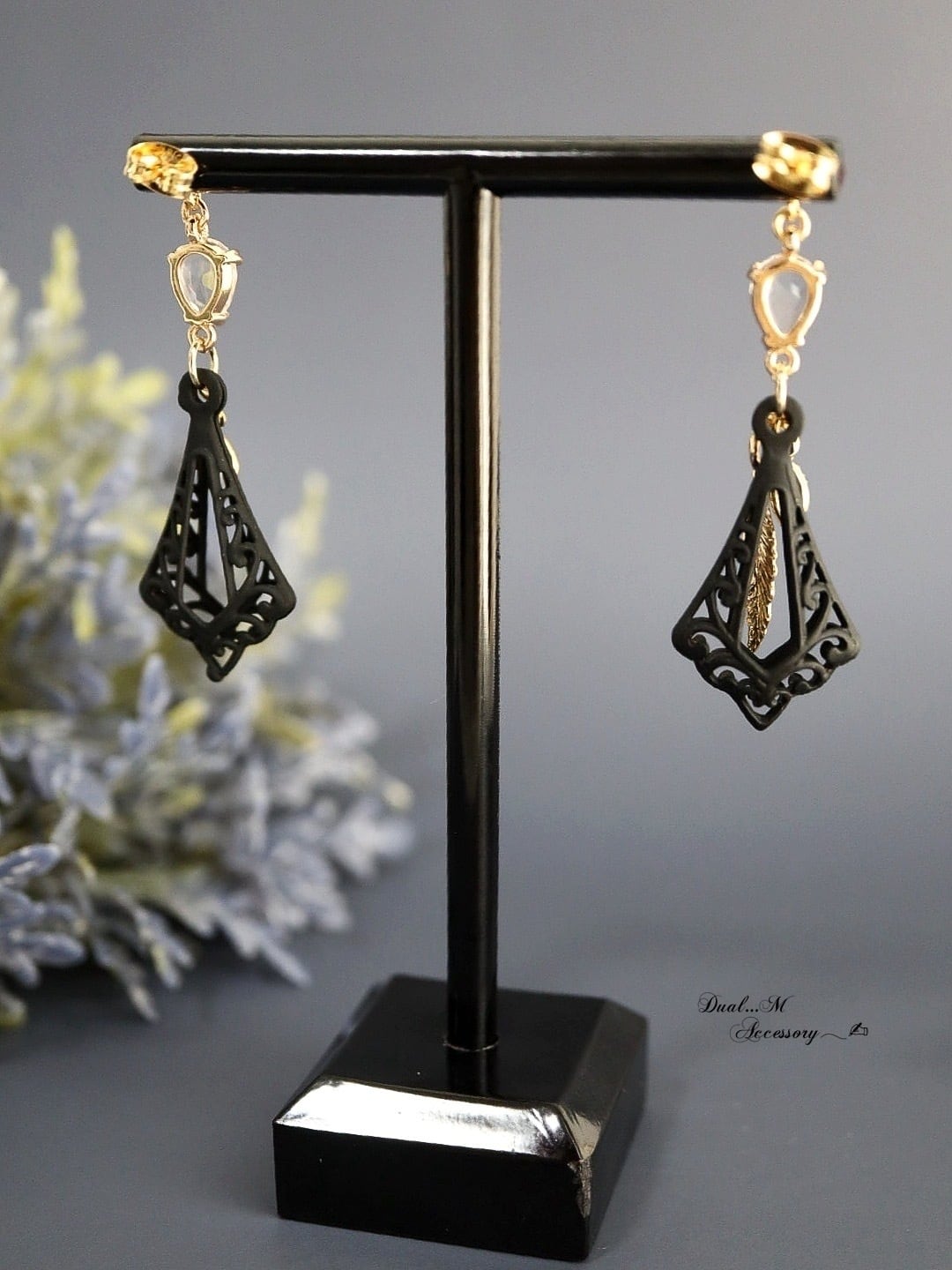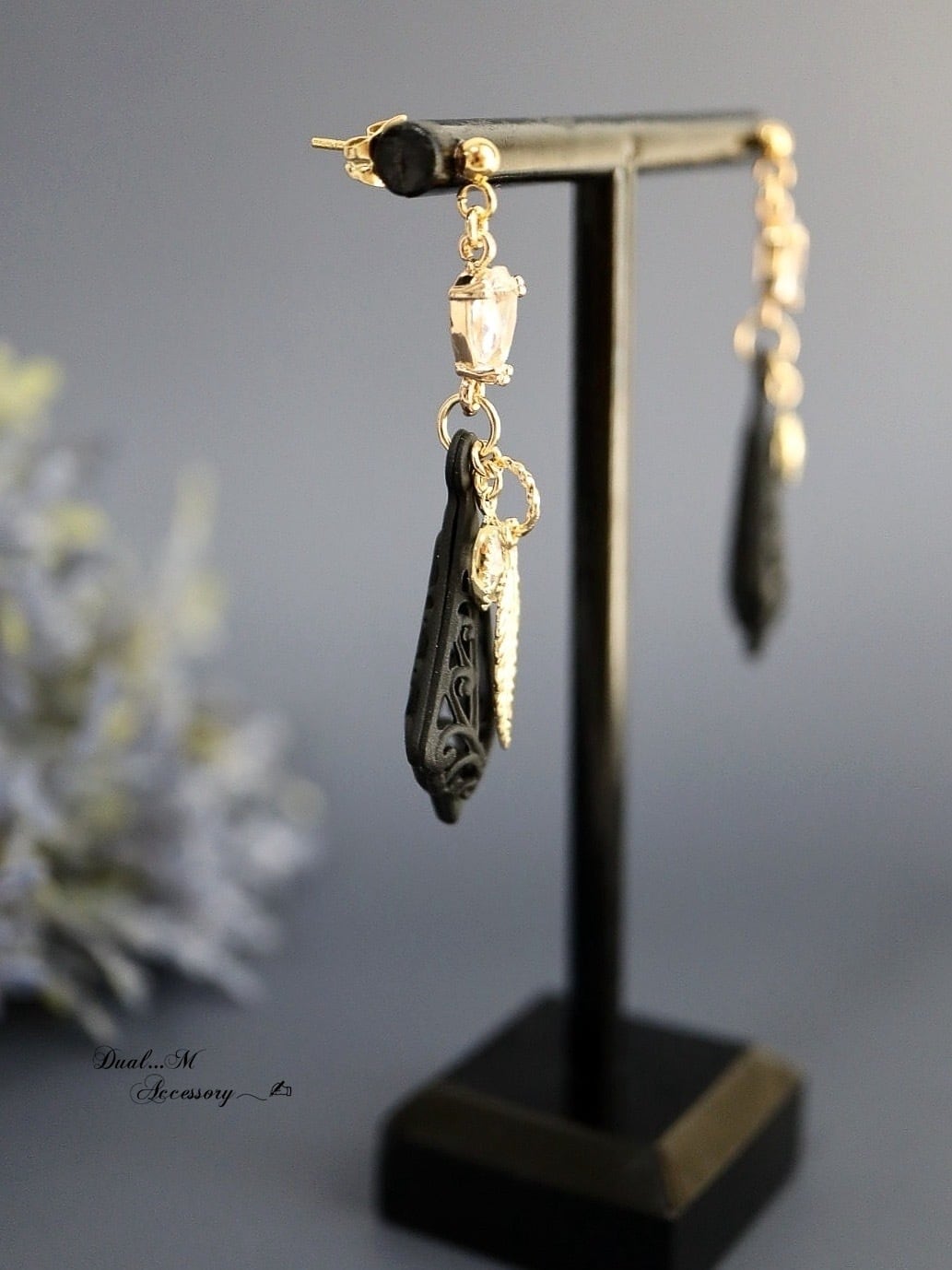 立体的なマットブラックのフレームは香水瓶を連想させるような魅力的なフォルム。揺れるゴールドの羽と小さなジルコニアチャームが視線を集めます。
