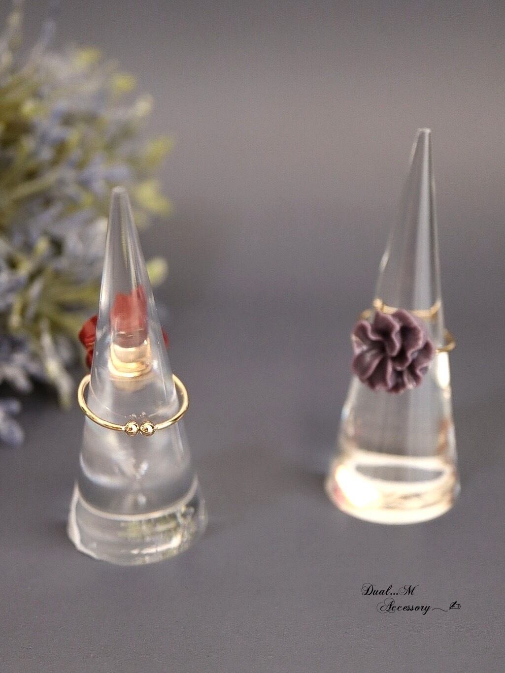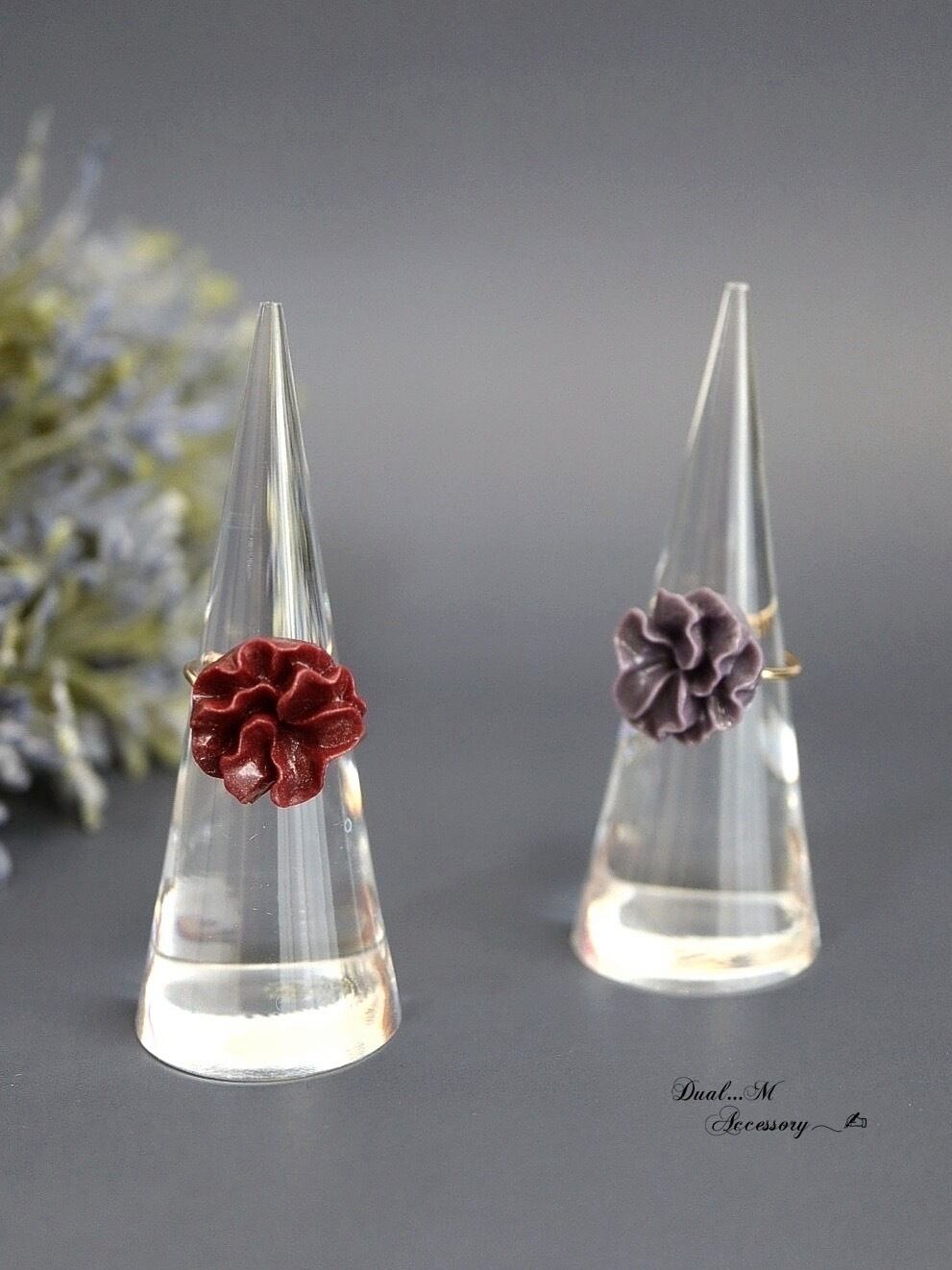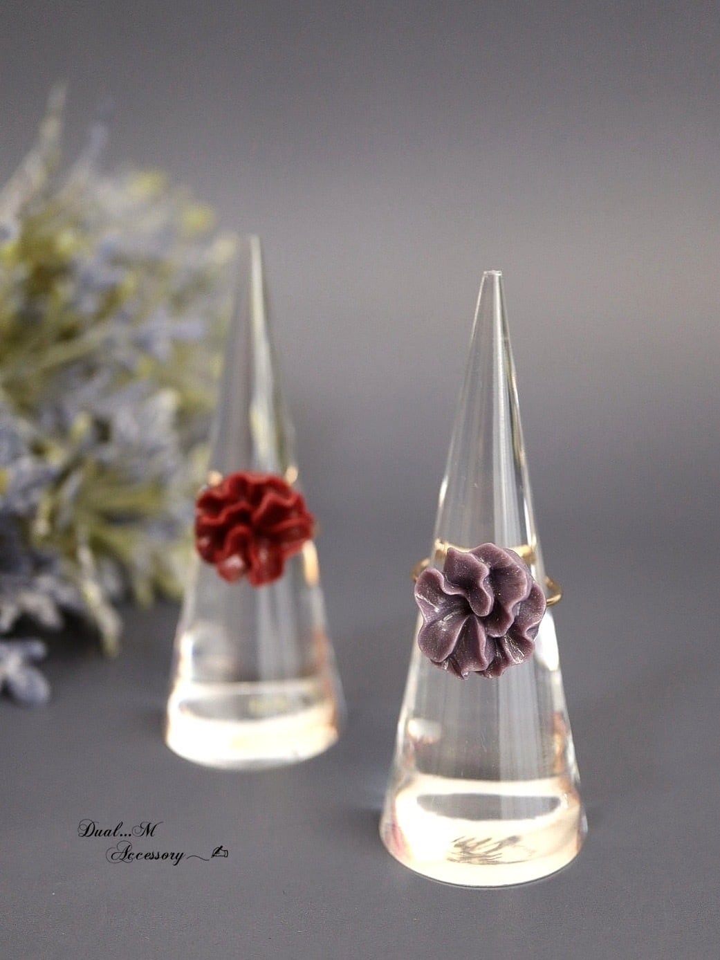 深みのあるカラーと立体的なフラワーモチーフが印象的なリングです。