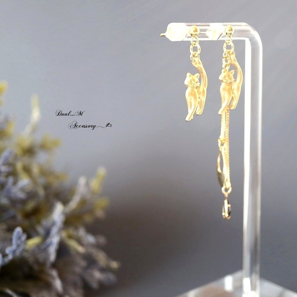 上品かつ可愛らしい、Catモチーフのピアスです。猫好きの方にはもちろん、上品なアクセサリーをお探しの方にもおすすめです。猫をモチーフにしたデザインでありながら、モダンで洗練された印象を与えるアクセサリー✧ どんなシーンでも違和感なく身に着けられるので、オフィスからカジュアルなお出かけまで幅広い場面で活躍します。大切な人へのギフトとしても喜ばれること間違いなしです。